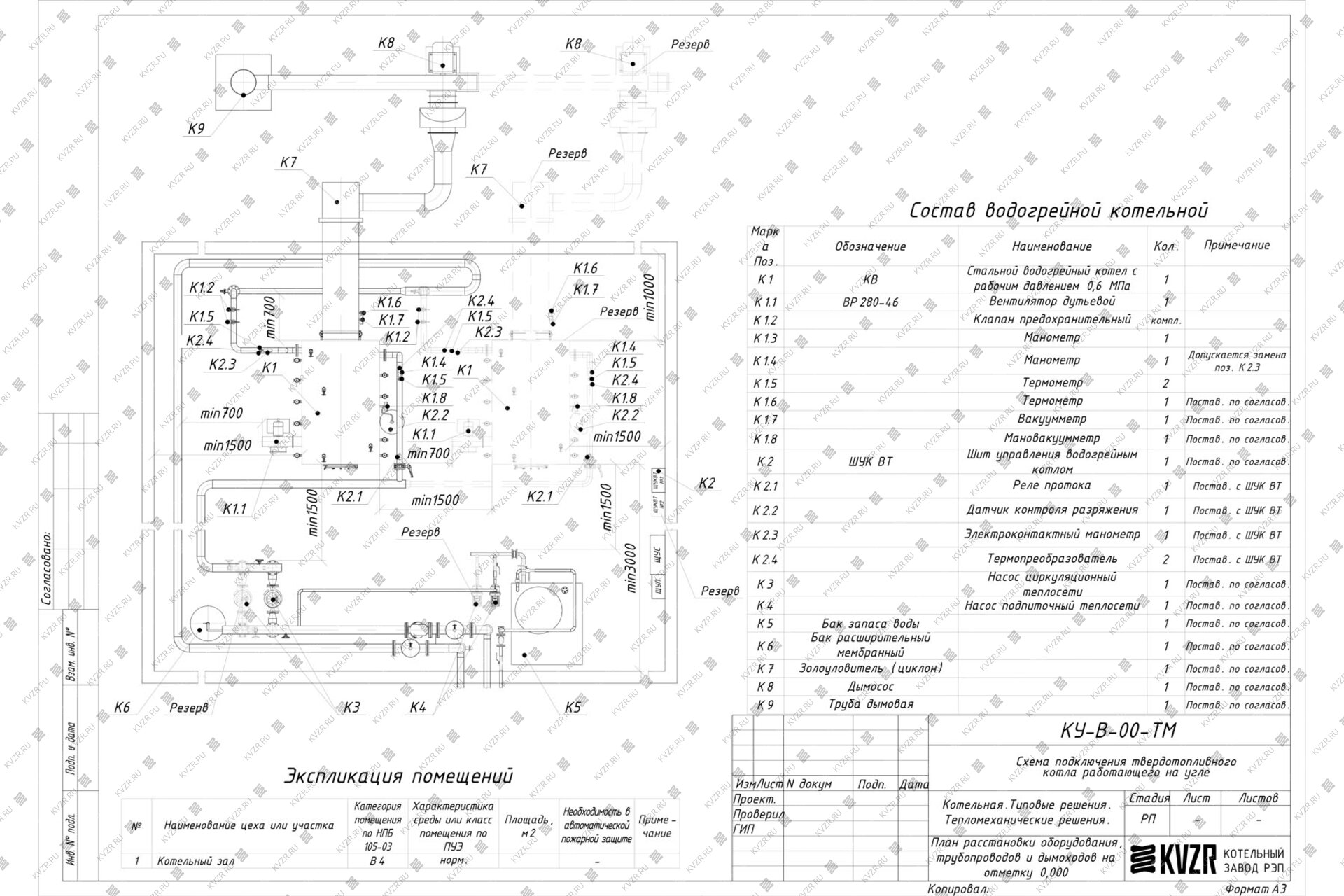 К вспомогательному оборудованию при подключении промышленного водогрейного котла КВр относят - щит управления котлом, насос циркуляционный, насос подпиточной воды, бак запаса воды, расширительный мембранный бак, дымовую трубу, систему газоходов и дымосос, золоуловитель (по желанию).