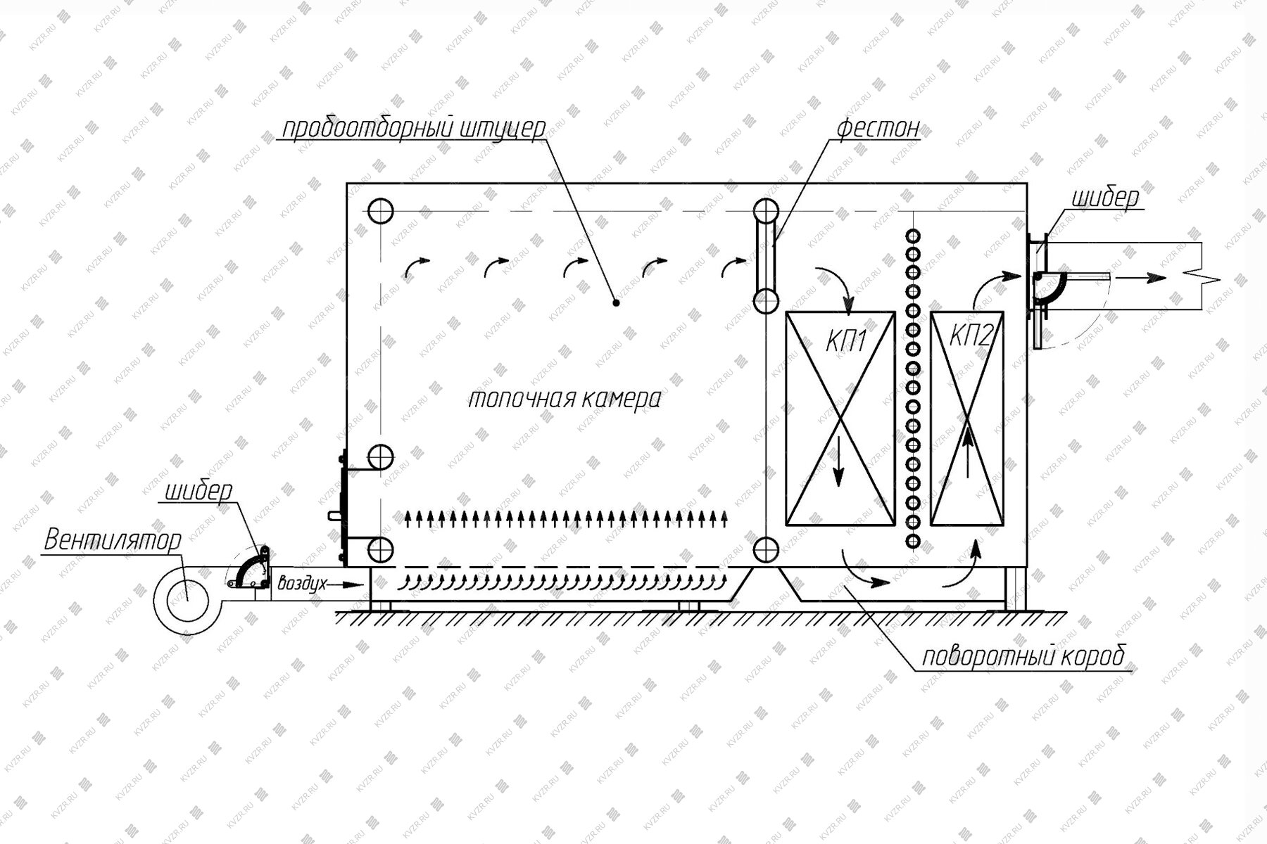 4. Удаление продуктов сгорания: Отработанные газы выводятся через шибер на задней стенке котла в газоход. Шлак удаляется через зольниковые люки.