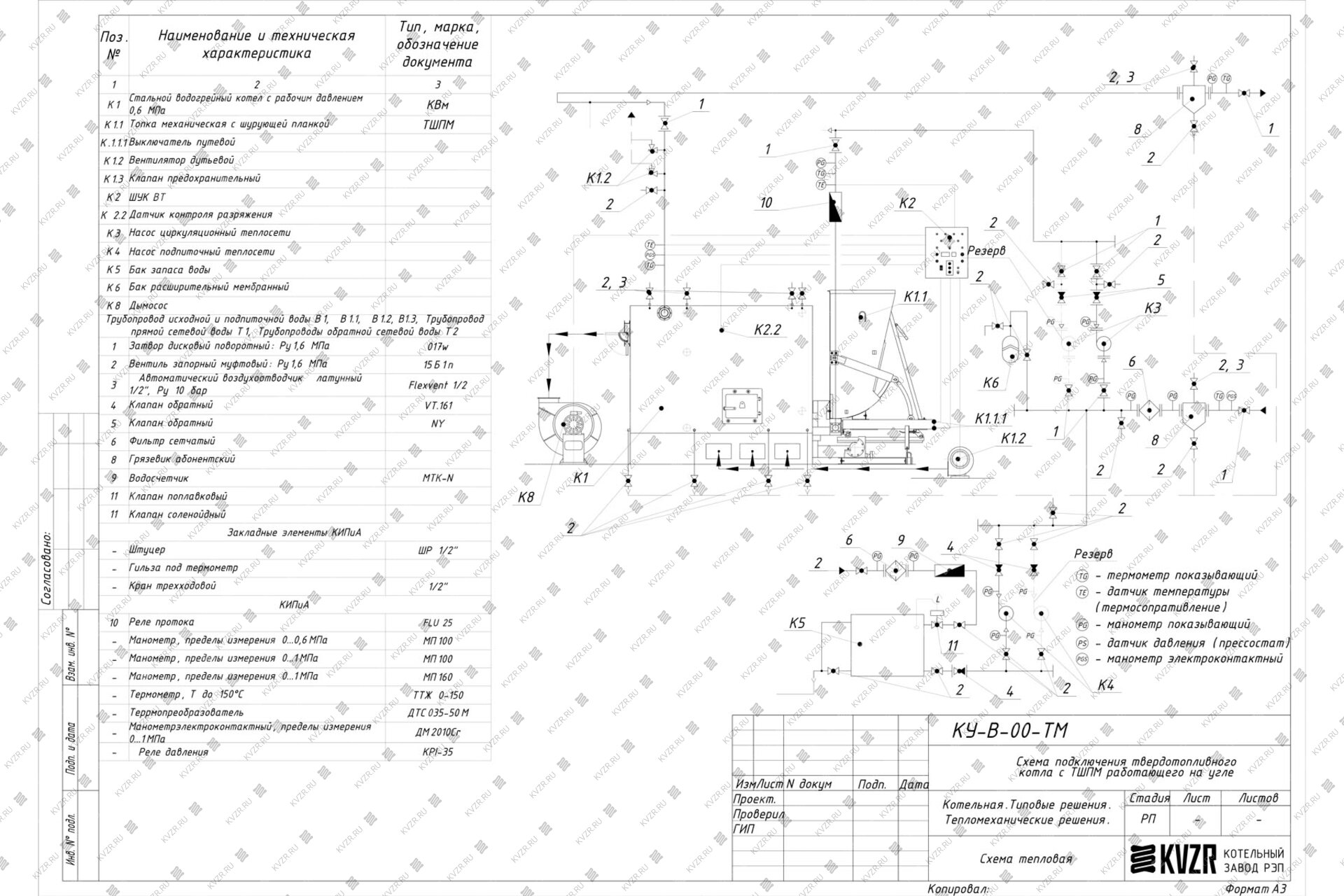 Образец тепловой схемы подключения оборудования в механической котельной приведен на данной схеме. При эксплуатации очень важно грамотно осуществить подключение оборудования, установить все контрольно измерительные приборы, для контроля параметров работы котельной и запорную арматуру для оперативного переключения потока теплоносителя при плановой или аварийной остановке оборудования. Данную схему можно использовать как пример для разработки под свой объект или заказать у нас разработку индивидуальной схемы для вашей котельной.