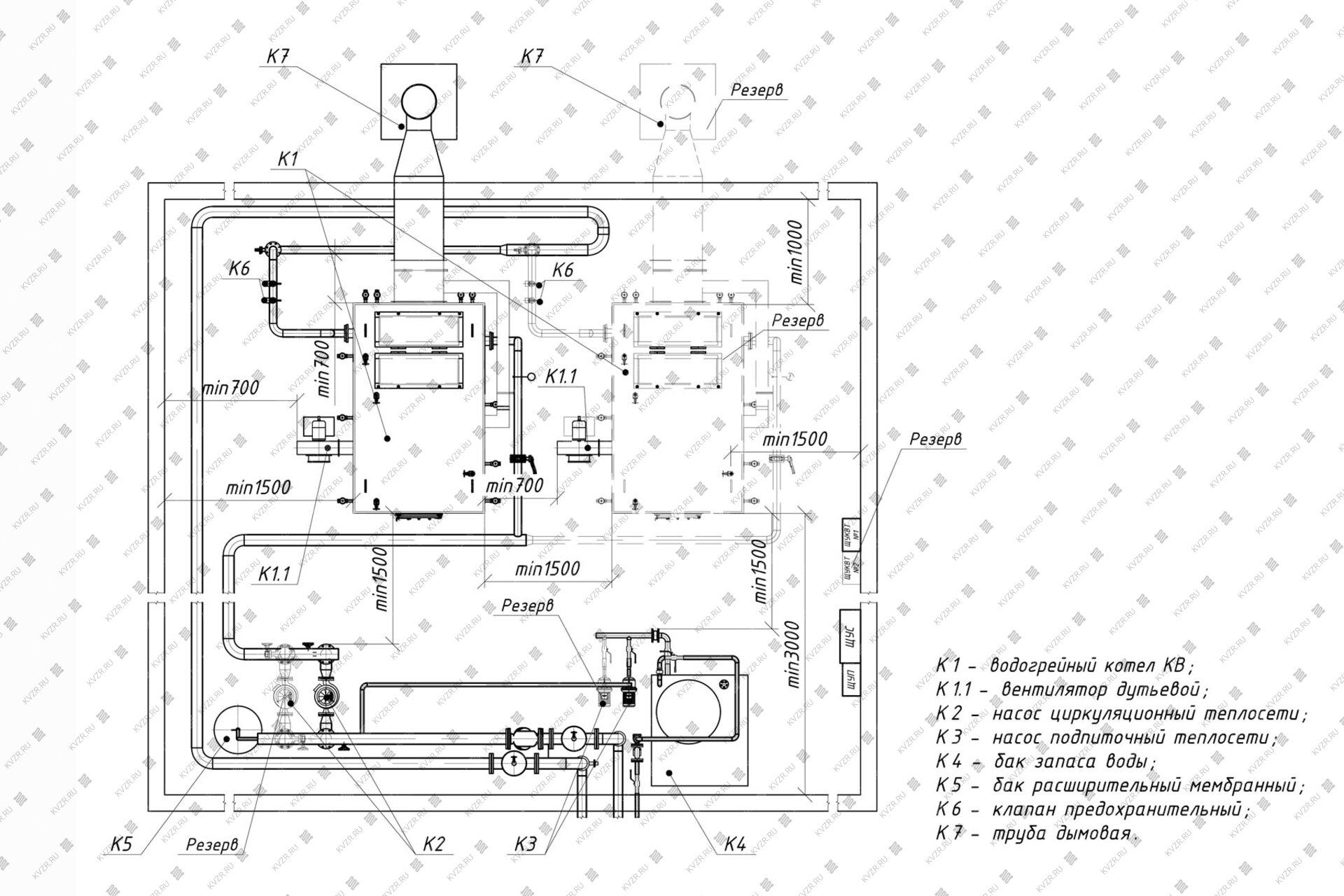 Чтобы правильно подключить котел 470 кВт на естественной тяге в котельной необходимо оставить проемы для обслуживания оборудования во время эксплуатации. На представленной здесь схеме указаны их минимальные размеры. Кроме того, в данной примерной схеме монтажа водогрейных котлов и оборудования указан перечень минимально необходимого вспомогательного оборудования для правильной работы котла.