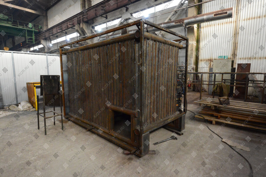 Блок водонагревательного котла КВм 3,5 МВт представляет собой горизонтальную стальную сварную конструкцию, состоящую из трубной системы (радиационной и конвективной поверхности нагрева), опорной рамы и каркаса с теплоизоляционными материалами, обшитого листовой сталью. Топочная камера состоит из труб Ø 57x3,5 мм. Конвективная поверхность нагрева состоит из пакетов выполненных из труб Ø 32x3 мм, для интенсификации теплообмена трубы пакетов расположены в шахматном порядке.