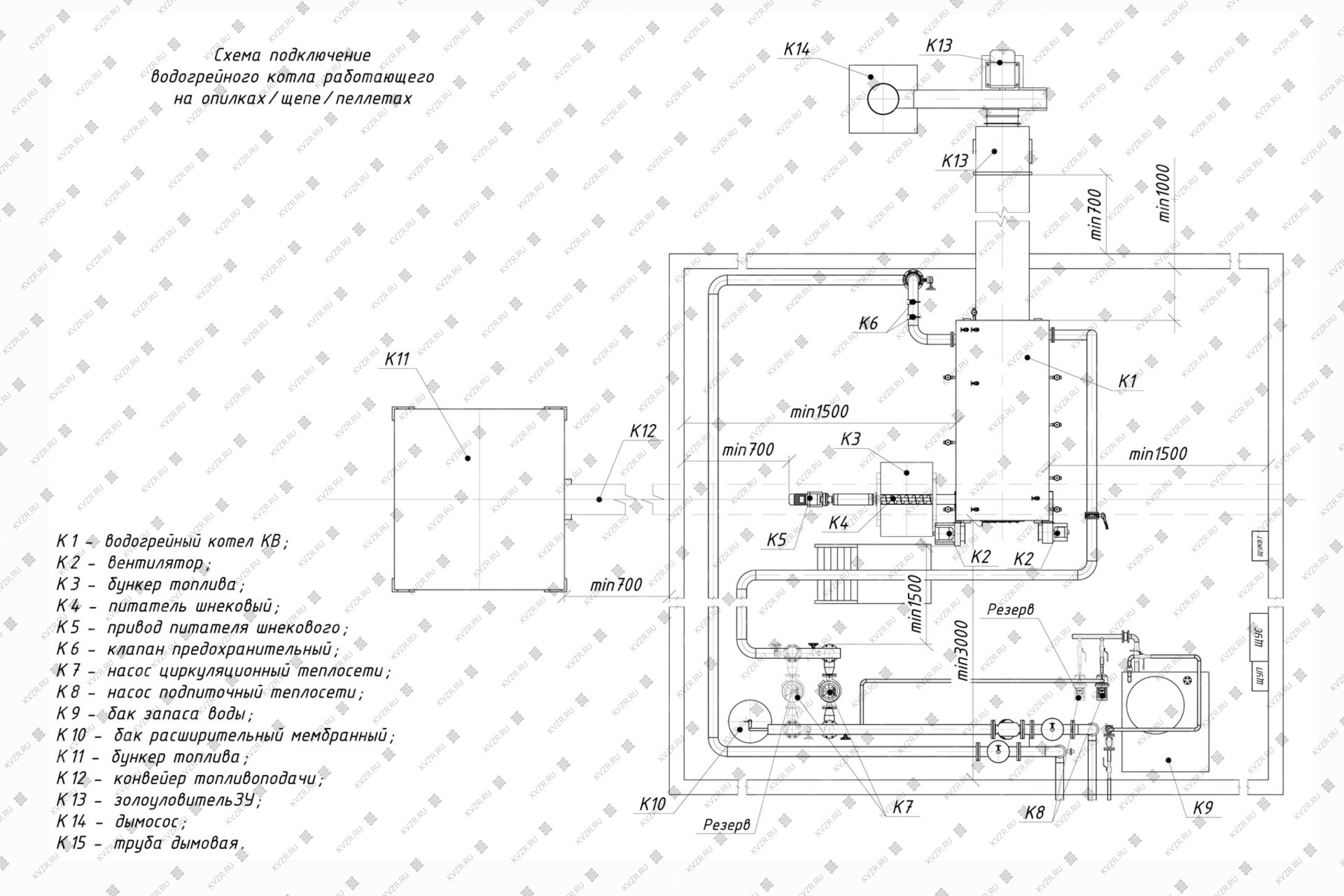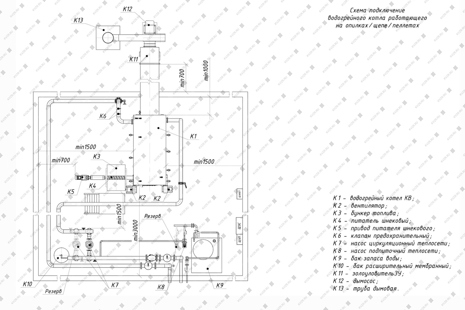 Чтобы правильно подключить пеллетный котел 0.4 МВт в котельной необходимо оставить проемы для обслуживания оборудования во время эксплуатации. На представленной здесь схеме указаны их минимальные размеры. Кроме того, в данной примерной схеме монтажа водогрейных котлов и оборудования указан перечень минимально необходимого вспомогательного оборудования для правильной работы котла.