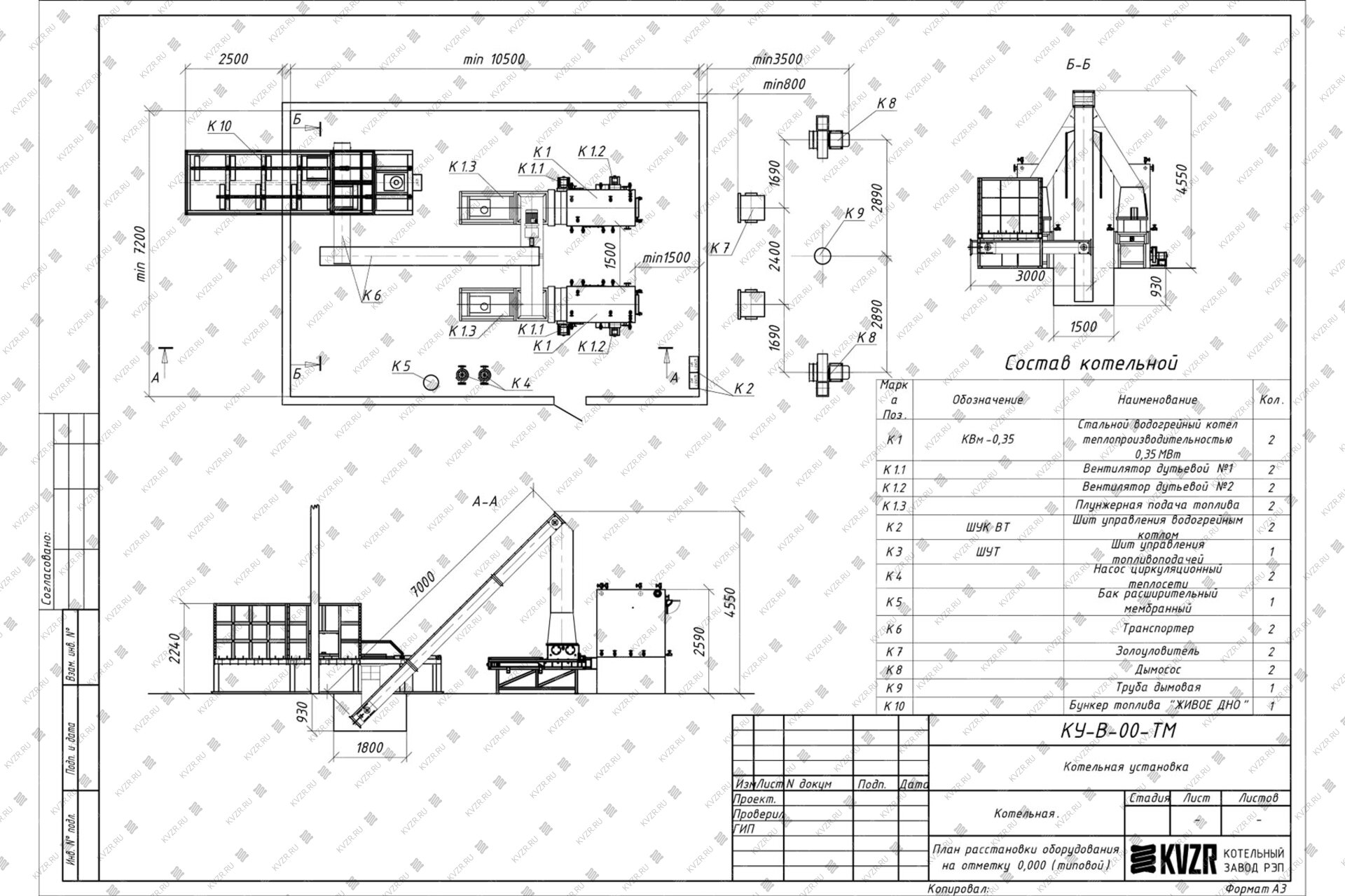 Чтобы правильно подключить котел 0.5 МВт на опилках в котельной необходимо оставить проемы для обслуживания оборудования во время эксплуатации. На представленной здесь схеме указаны их минимальные размеры. Кроме того, в данной примерной схеме монтажа водогрейных котлов и оборудования указан перечень минимально необходимого вспомогательного оборудования для правильной работы котла.